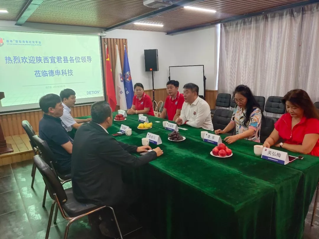 2019年9月2日上午,德申科技创始人、CEO许武顺先生,联合创始人李苹女士在德申科技信息中心接待了陕西省宜君县副县长郭海鹏,财政局局长白会川,经贸局局长张忠民,统计局局长白亮,招商局局长贺佳斌。双方就促进德申国际商务社交平台与陕西宜君县开展商务交流与合作,带动中小企业和相关农业产业的发展,推动各行业、各领域合作进行了深入会谈。